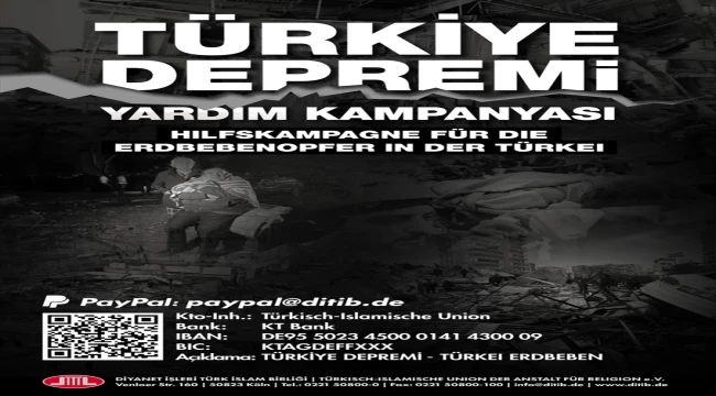 Merkezi Almanya'nın Köln kentinde bulunan DİTİB'in Genel Başkan Vekili Abdurrahman Atasoy, yayımladığı yazılı mesajda, başta Kahramanmaraş ve Gaziantep olmak üzere oldukça geniş bir bölgeyi etkileyen deprem nedeniyle DİTİB olarak yardım kampanyası başlattıklarını belirtti.