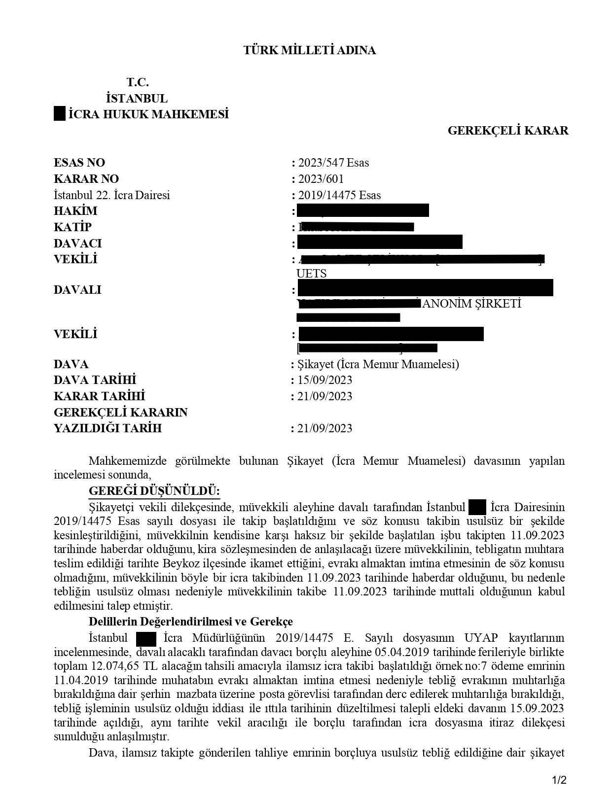 Tebliğ takibine yapılan itiraz ise şu cümleler ile reddedildi: Şikayetçinin UYAP Vatandaş Portal sisteminden giriş yapmak suretiyle; 07 ağustos 2023 tarihinde saat 13:26'da haciz talebini incelediği, eldeki şikayetin ise 15 Ağustos 2023 tarihinde yapıldığı görülmektedir.