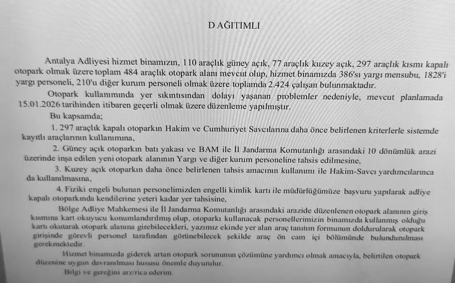 Adliye yönetimi tarafından dağıtımlı olarak gönderilen resmi yazıya göre; Antalya Adliyesi hizmet binasında toplam 484 araçlık otopark bulunmasına rağmen, binada 2 bin 424 personel görev yapıyor. Artan personel sayısı ve araç yoğunluğu nedeniyle yaşanan yer sıkıntısının ardından yapılan yeni planlamada, 297 araçlık kapalı otoparkın yalnızca hâkim ve savcıların kullanımına bırakılması dikkat çekti.
