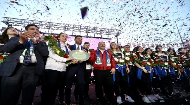 Takım kaptanı Melike Kasapoğlu ve Başantrenör Merve Yılmaz'ın da konuşma yaptığı kutlamaların sonunda Bakan Varank ve oyuncular şampiyonluk kupasını birlikte kaldırdı.