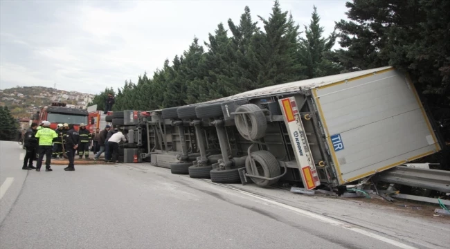 Kocaeli'nin İzmit ilçesinde kurşun yüklü tırın bariyere çarparak devrilmesi, D-100 kara yolunun Ankara yönünde ulaşımın aksamasına neden oldu.
