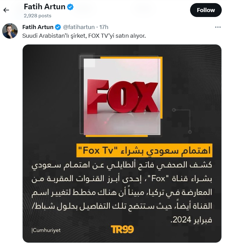 ABD'de yaşayan gazeteci Fatih Artun, FOX TV'nin el değiştireceğini dünyaya ilk duyuran kişi oldu. Artun'un, X hesabından yaptığı paylaşım: