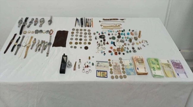 Sahte kimlik ibraz ettiği ve ülkeye kaçak girdiği belirlenen zanlının çanta ve üst aramasında, değerli taş ölçüm cihazı, değerli olduğu değerlendirilen 119 taş, tarihi olduğu değerlendirilen 29 para, 1 yılan derisi, 6 kolye, 25 kol saati, 9 kalem ve 10 bin 430 avro ele geçirildi.