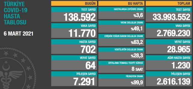 Koronavirüs ülkemizde yeniden yükselişe geçti. Sağlık Bakanlığı 06 Mart 2021 cumartesi gününe ait güncel rakamları açıkladı.