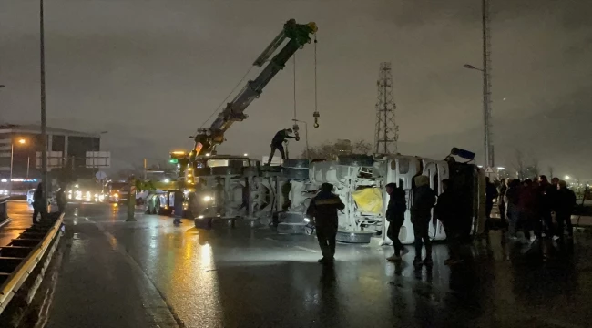 Devrilen kamyonu yoldan kaldırma çalışmaları sürüyor.