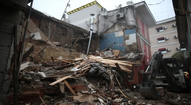 İş yeri dar sokakta olduğu için küçük iş makineleriyle bölgeye gelen ekipler, enkazdan çıkan molozları ana caddeye taşıyarak kamyonlara yüklüyor.