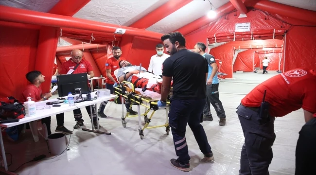 Sağlık ekiplerinin haberdar olmadığı 7/24 devam eden senaryolar gereği deprem, patlama ve kazalarda yaralanan hastalara sahra hastanelerinde ilk müdahaleleri yapılıyor.