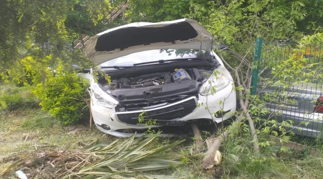 Kontrolden çıkan otomobil, önce kaldırımdaki beton dubalara ardından da yol kenarında bulunan ağaç ve tel örgülere çarpıp durabildi.