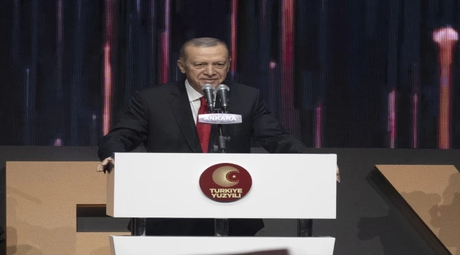 Vatandaşlara hitap eden Erdoğan, daha sonra salona geçti. Salona, "Gözlerimizde gelecek, zihnimizde tarihin getirdikleriyle Türkiye Yüzyılı ", "Barışın, başarının, gücün, değerlerin, haklının, bilimin, dijitalin, verimliliğin, şefkatin, iletişimin, kalkınmanın, üretimin, istikrarın, huzurun yüzyılı başlıyor" yazılı pankartlar asıldı.